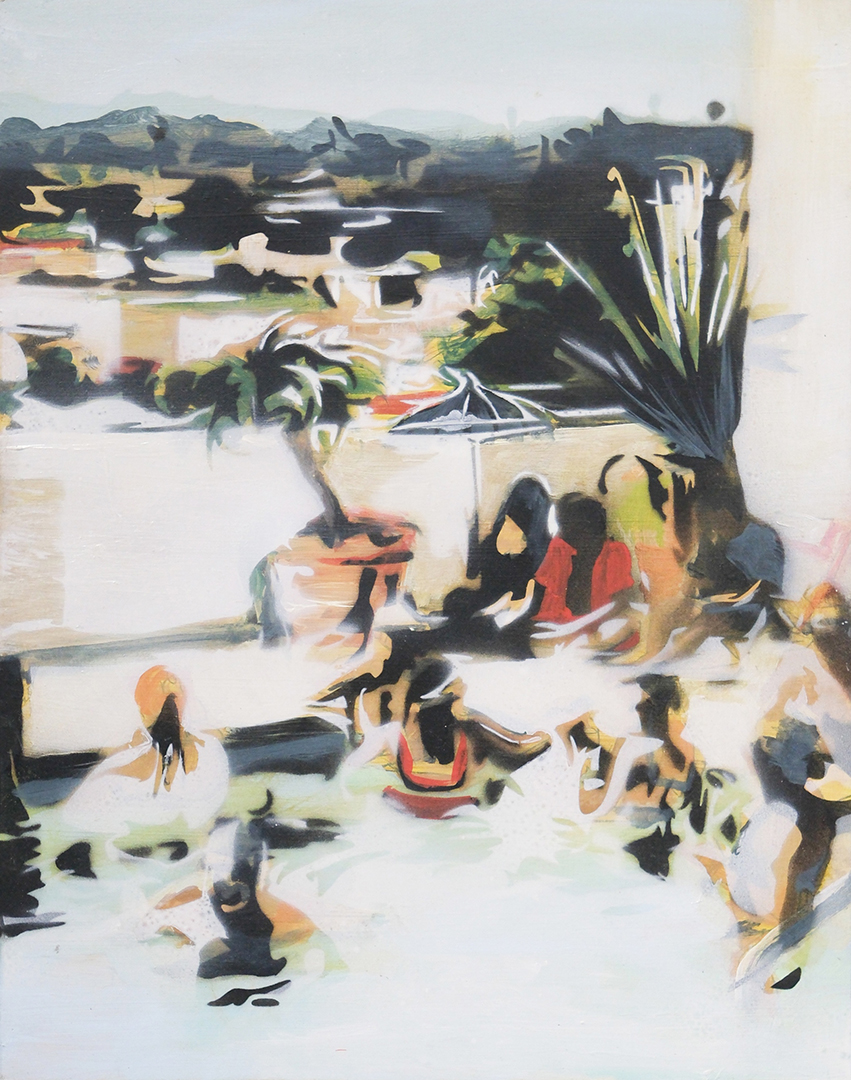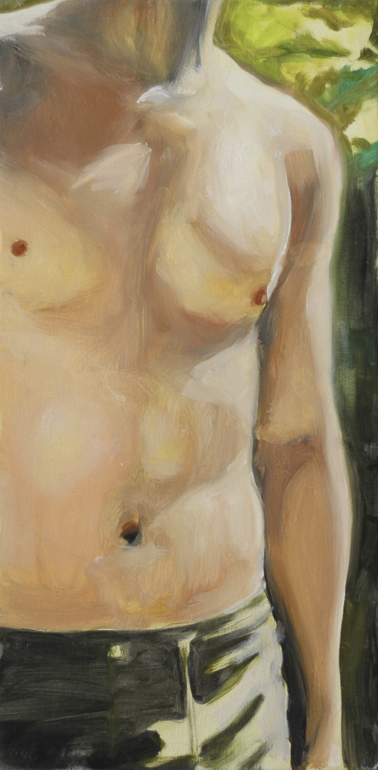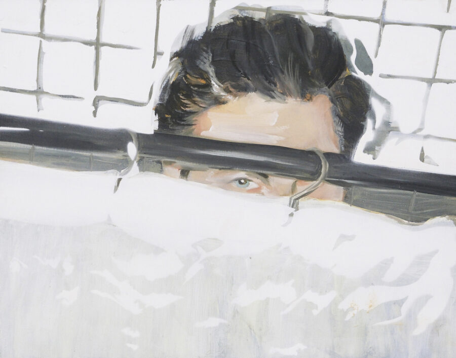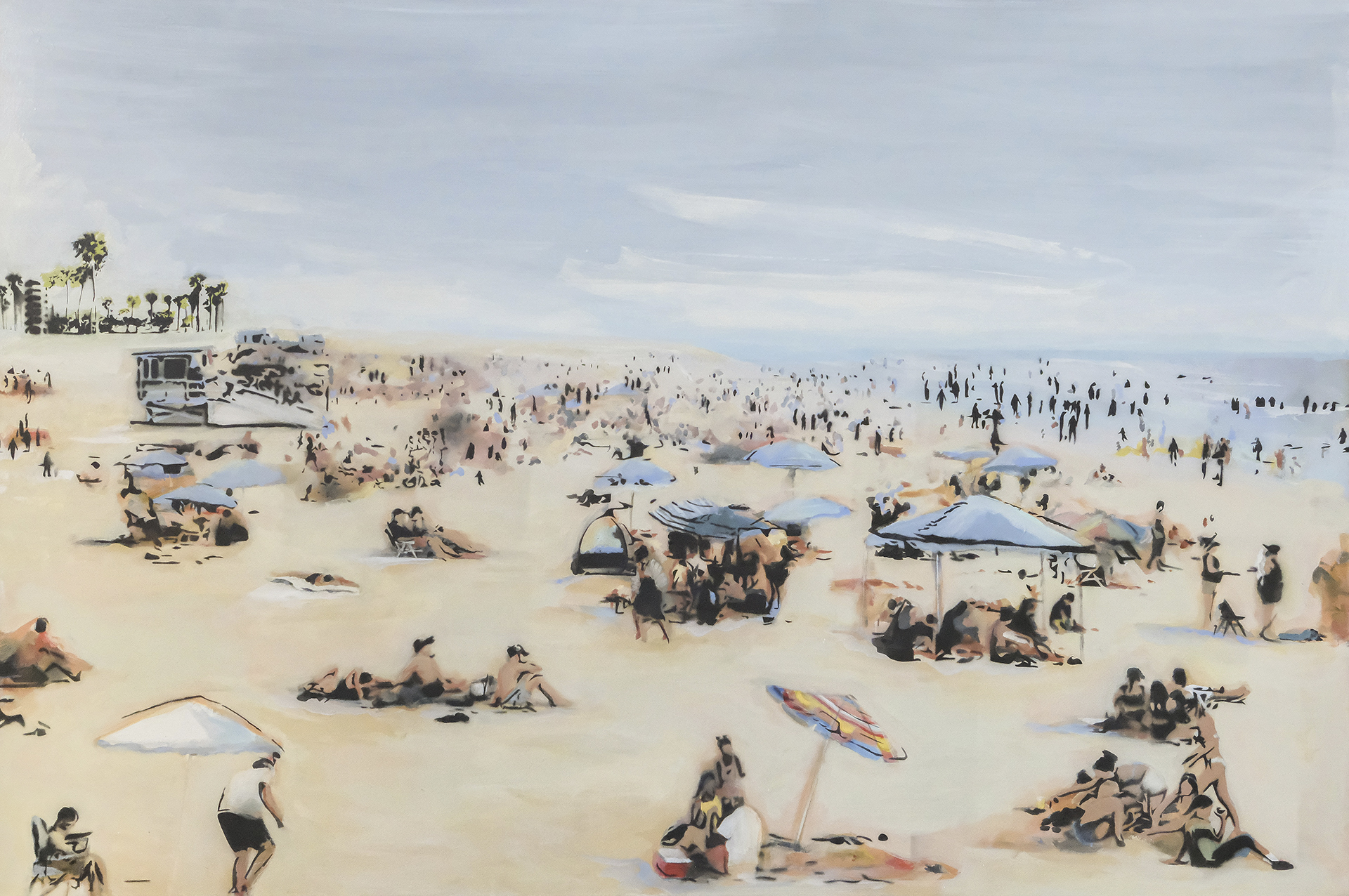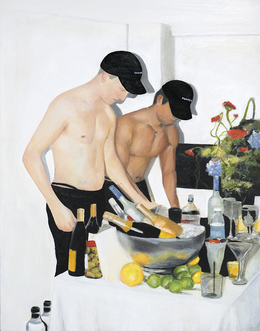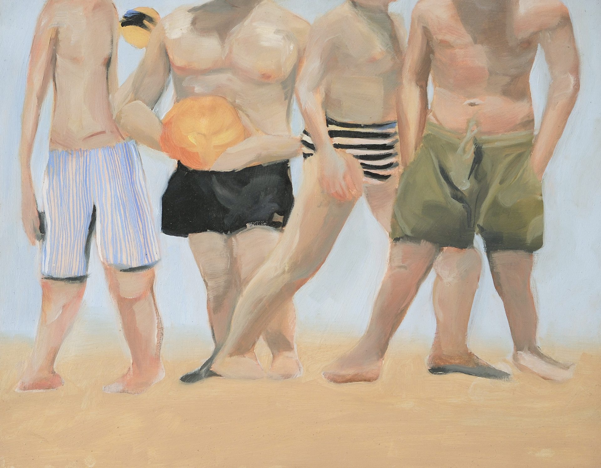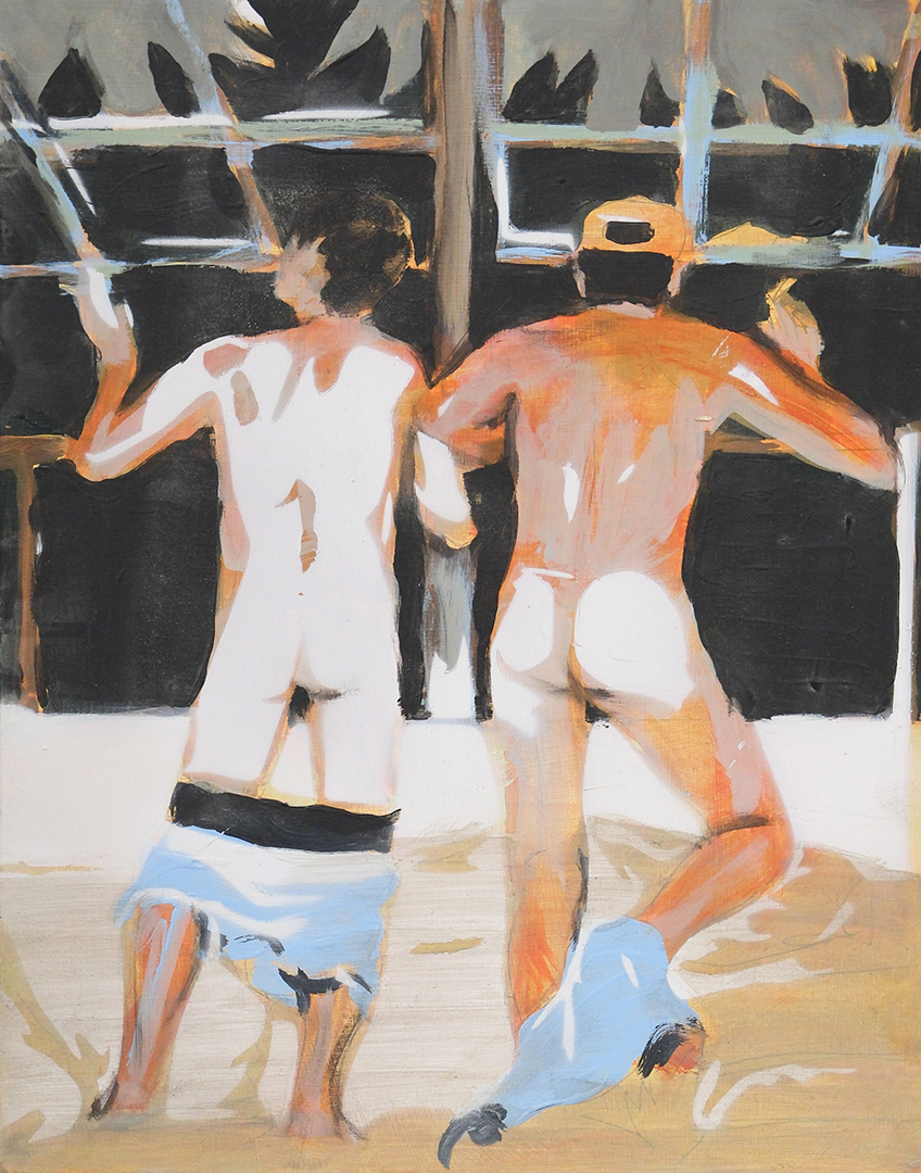 Working from original film photographs, Atkinson translates fleeting, journalistic images into vignettes that explore queer intimacy, the male gaze, and the nostalgia of California summer. Atkinson’s process involves layering oil and acrylic paint with passages of spray paint, which acts as both a mask and an erasure. The spray flattens parts of the image, tightening the composition, while allowing the brushwork elsewhere to remain loose, expressive, and gestural. This process nods to the way memory functions – subjectively with some details sharply fixed, and others that contain more emotion and fluidity.
