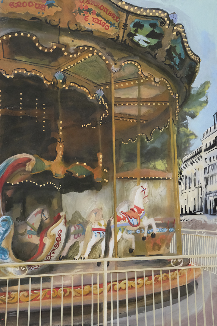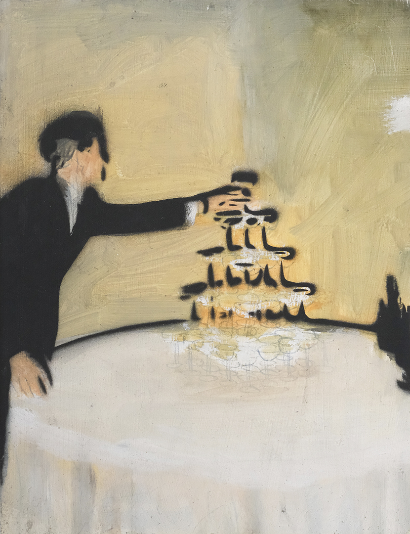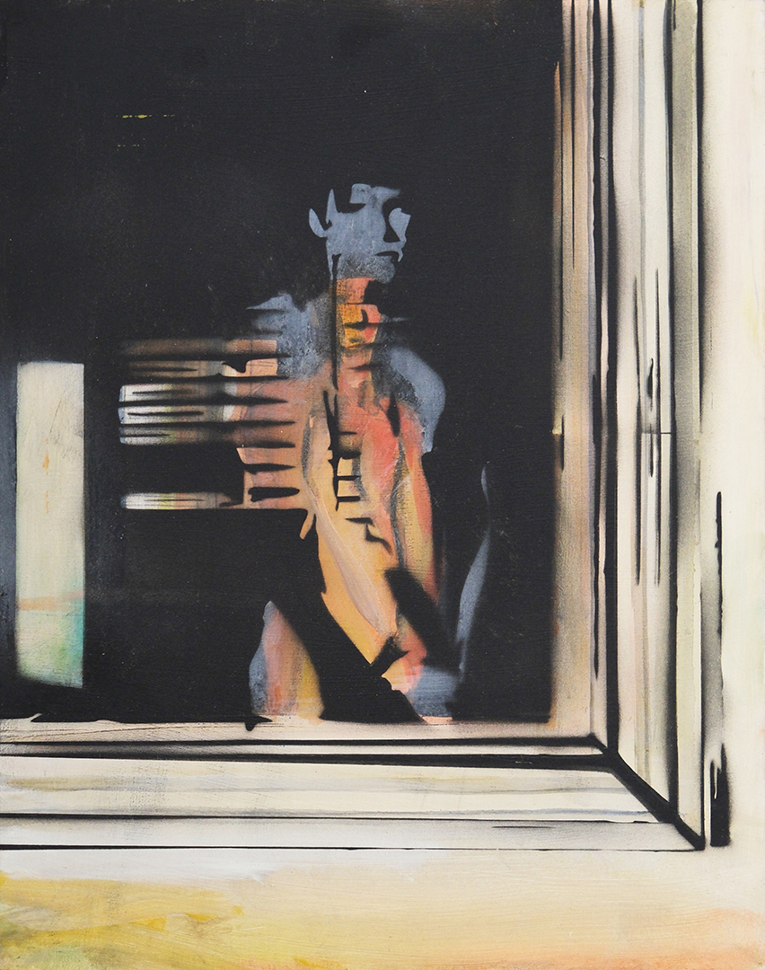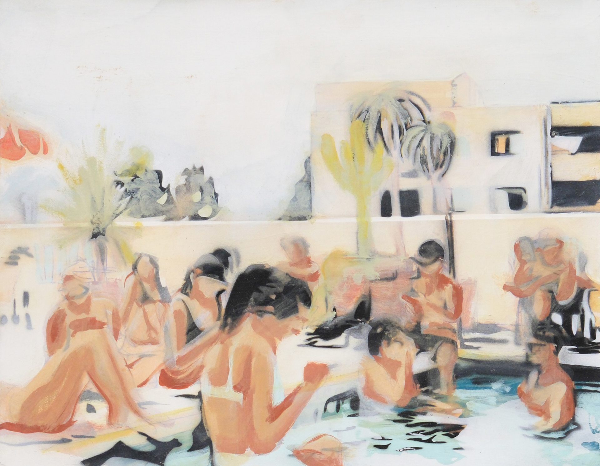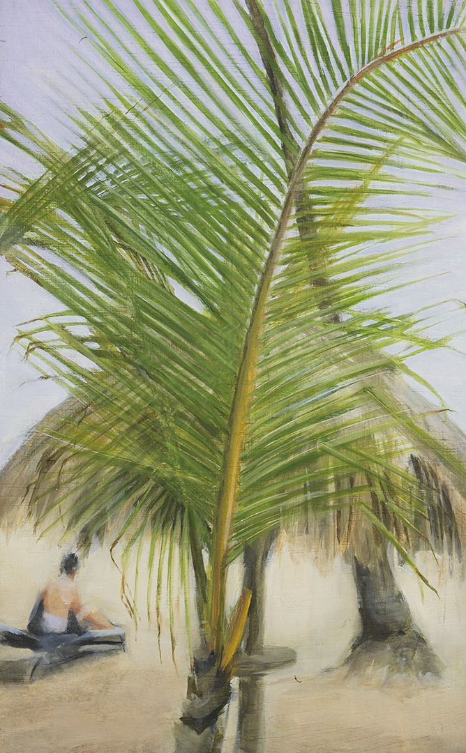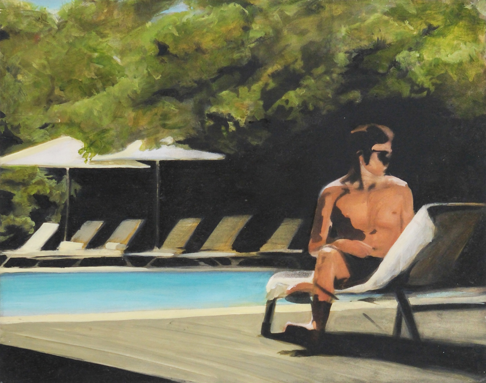Working from original film photographs, Atkinson translates fleeting, journalistic images into vignettes that explore queer intimacy, the male gaze, and the nostalgia of California summer. Atkinson’s process involves layering oil and acrylic paint with passages of spray paint, which acts as both a mask and an erasure. The spray flattens parts of the image, tightening the composition, while allowing the brushwork elsewhere to remain loose, expressive, and gestural. This process nods to the way memory functions – subjectively with some details sharply fixed, and others that contain more emotion and fluidity.